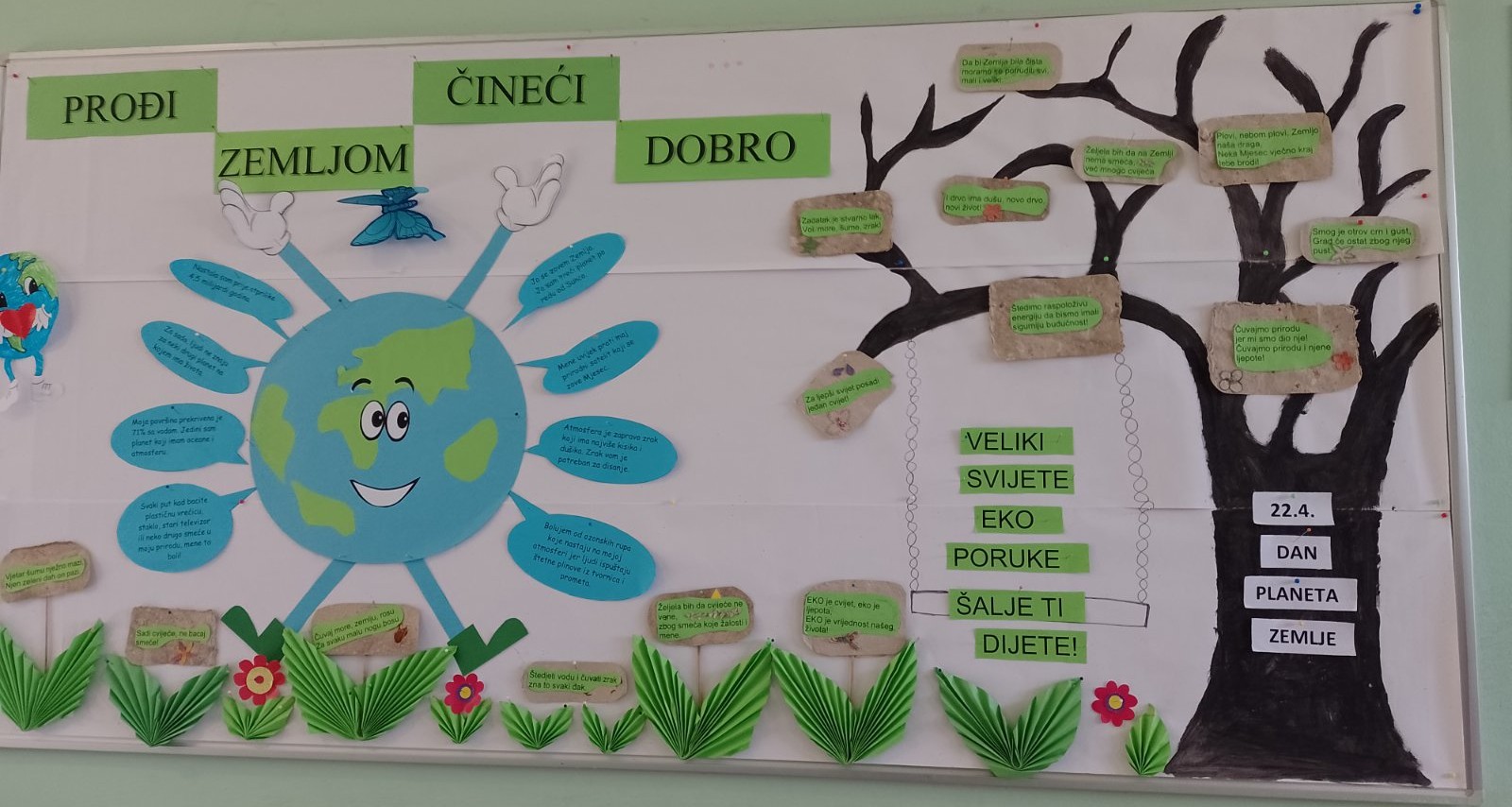 Likovni izričaj bio je vrlo raznolik – učenici su izrađivali prikaze planeta Zemlje koristeći različite likovne tehnike i materijale, pokazujući maštovitost i kreativnost. Zajedničkim radom nastalo je i „stablo razreda“, sastavljeno od učeničkih radova, koje simbolizira zajedništvo, rast i brigu za prirodu.