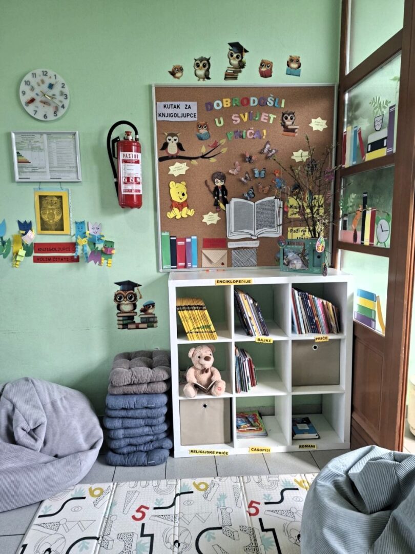 • čitati priče – kratki kviz o pročitanoj priči, ilustriranje naslovnice knjige, izrada štapnih lutaka i dramatizacija priče, pisanje pisma glavnom liku, izrada diploma „Čitatelj mjeseca“, foto kutak s knjigom…